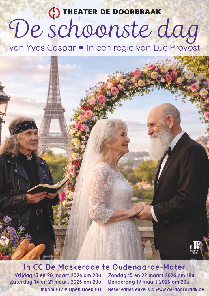Alex en Ingrid zijn al jaren een koppel, maar omdat trouwen volgens Alex alleen maar handenvol geld kost, ziet hij er het nut niet van in. Net op het moment dat ze zich klaarmaken om naar een trouwfeest van vrienden te vertrekken, komt Lucien – de vader van Alex – vertellen dat hij een vrouw heeft leren kennen … op het internet. Bij Alex gaan alle alarmbellen af, want hij vreest dat zij zijn vader gaat pluimen. Groot is echter zijn verbazing als Lucien, onder het motto “Time is money”, snel wil huwen met zijn grote liefde Sybille, afkomstig uit Parijs. Als dan ook de kinderen van Sybille verschijnen is het hek helemaal van de dam. Een koppige dochter, een bemoeizieke schoonzoon, een overijverige weddingplanner en een excentrieke vrouwelijke “voorganger” met een verleden bereiden samen het feest voor. Wordt het echt de schoonste dag van hun leven ? Bereid je voor op een avond vol herkenbare humor, hilarische familieperikelen en misschien… toch nog een vleugje romantiek!